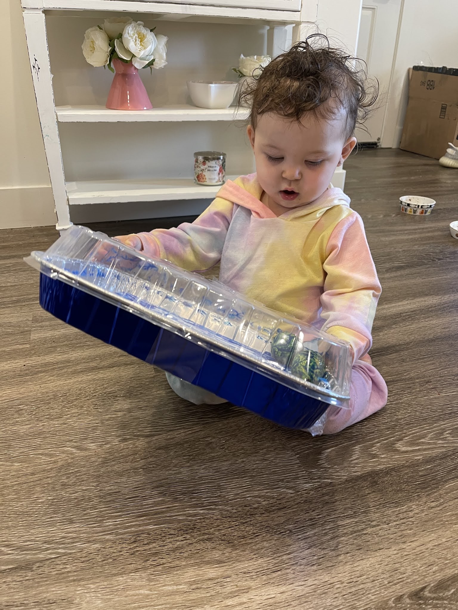 Hello Spring!! I am so excited that it is finally starting to warm up outside! To celebrate I wanted to do some gardening with Lola... So we put together this edible sensory bin. It is messy so we took it outside. She loved being able to play in the dirt (chocolate cereal), eat the worms (sour candy worms) and plant flowers. It was easy to put together and I found most of my supplies from the dollar store.